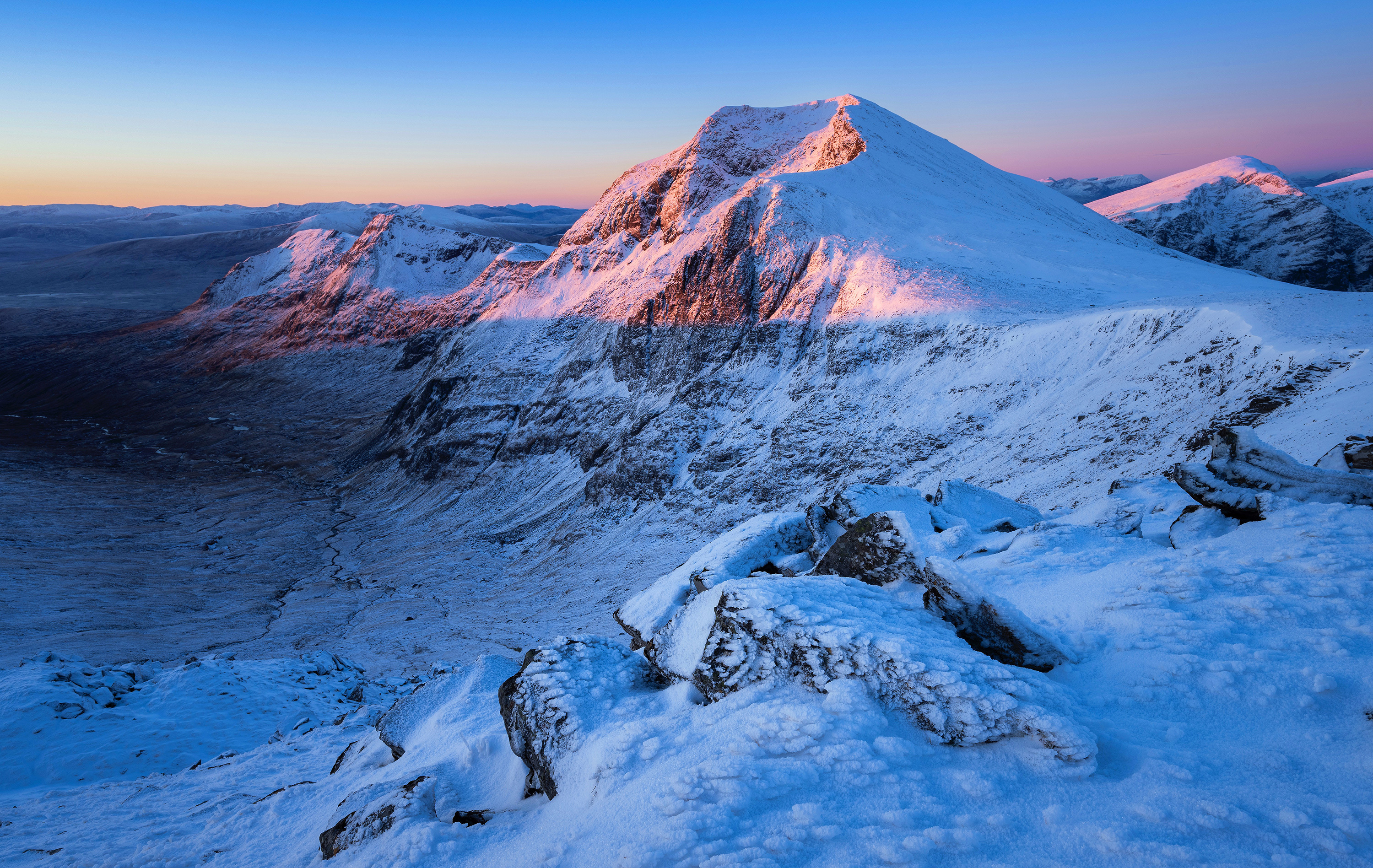First light on Sgurr nan Clach Geala 1093m in the Fannichs, Easter Ross, Scotland. This magnificent mountain is a fine north-south ridge with an impressive eastern corrie of broken crags. Its name means ‘Peak of the White Stones’. Close by are the neighbouring Munros of Meall a’ Chrasgaidh 934m and Sgùrr nan Each 923m.