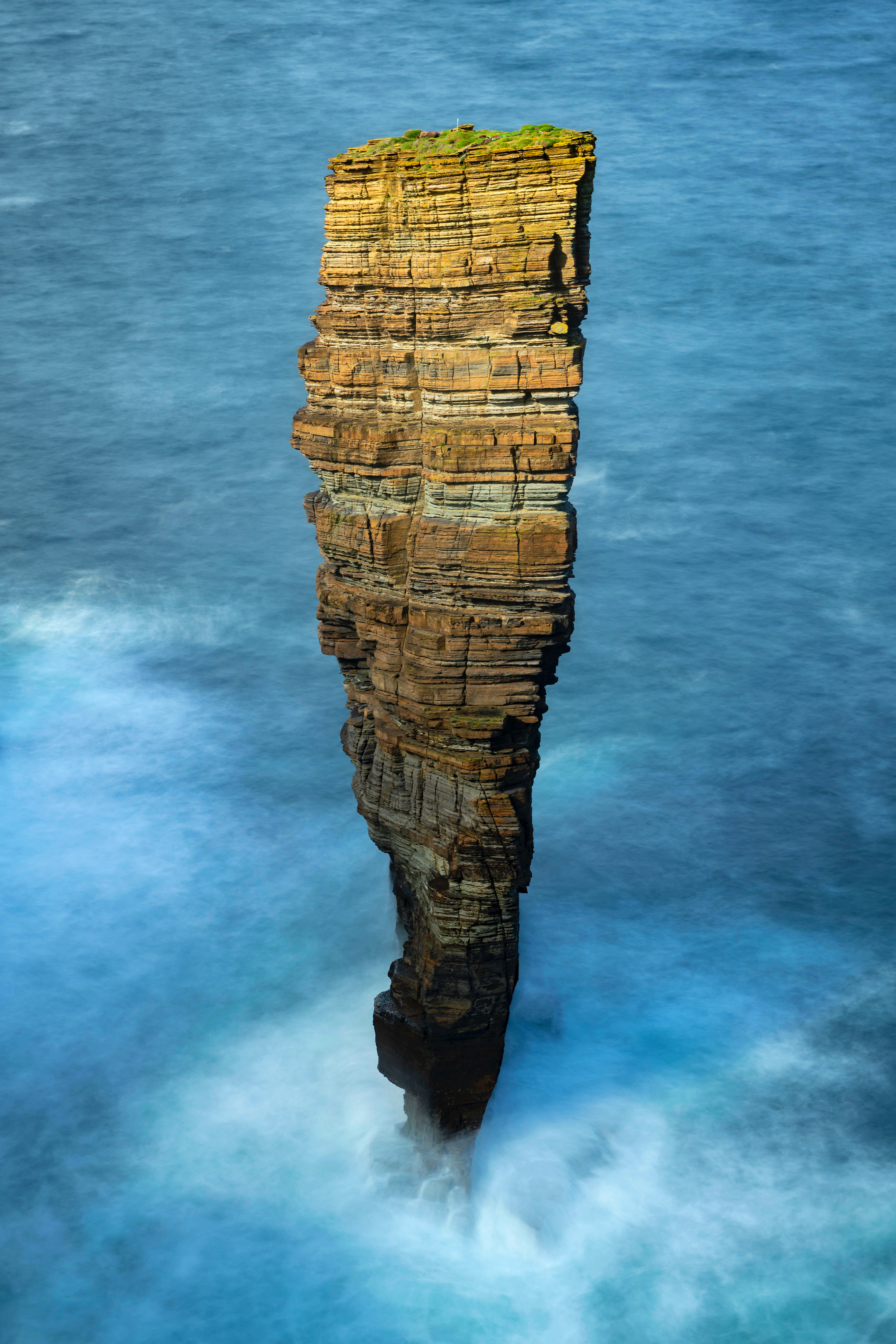 North Gaulton sea stack stands 49m high off the wild west coast of the main island of Orkney. This coastline is littered with sea-stacks, caves and natural arches, dramatic features formed by eons of wave action.