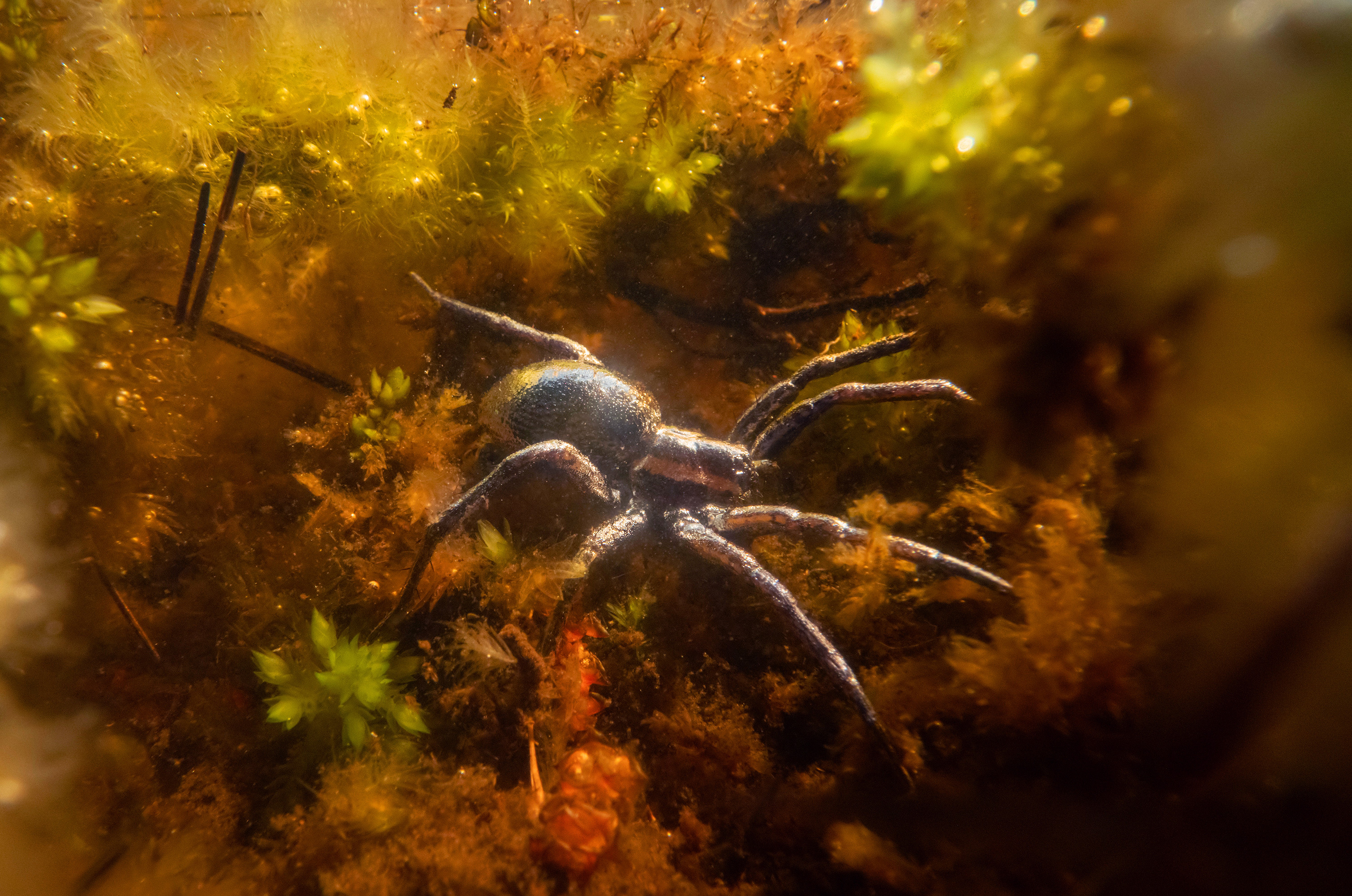 The Raft Spider Dolomedes fimbriatus inhabits unpolluted bogs, ponds and marshes. It can be spotted sitting near the water, its legs touching the surface. When it feels the vibrations of potential prey, it rushes out to catch it, floating like a raft. Whilst underwater this spider breathes from an air bubble trapped around its body where it feeds on invertebrate larvae, and sometimes tadpoles or small fish. They remain ‘vulnerable’ to extinction on both the global and British IUCN Red List and are listed as a Priority Species in England under the Environment Act.