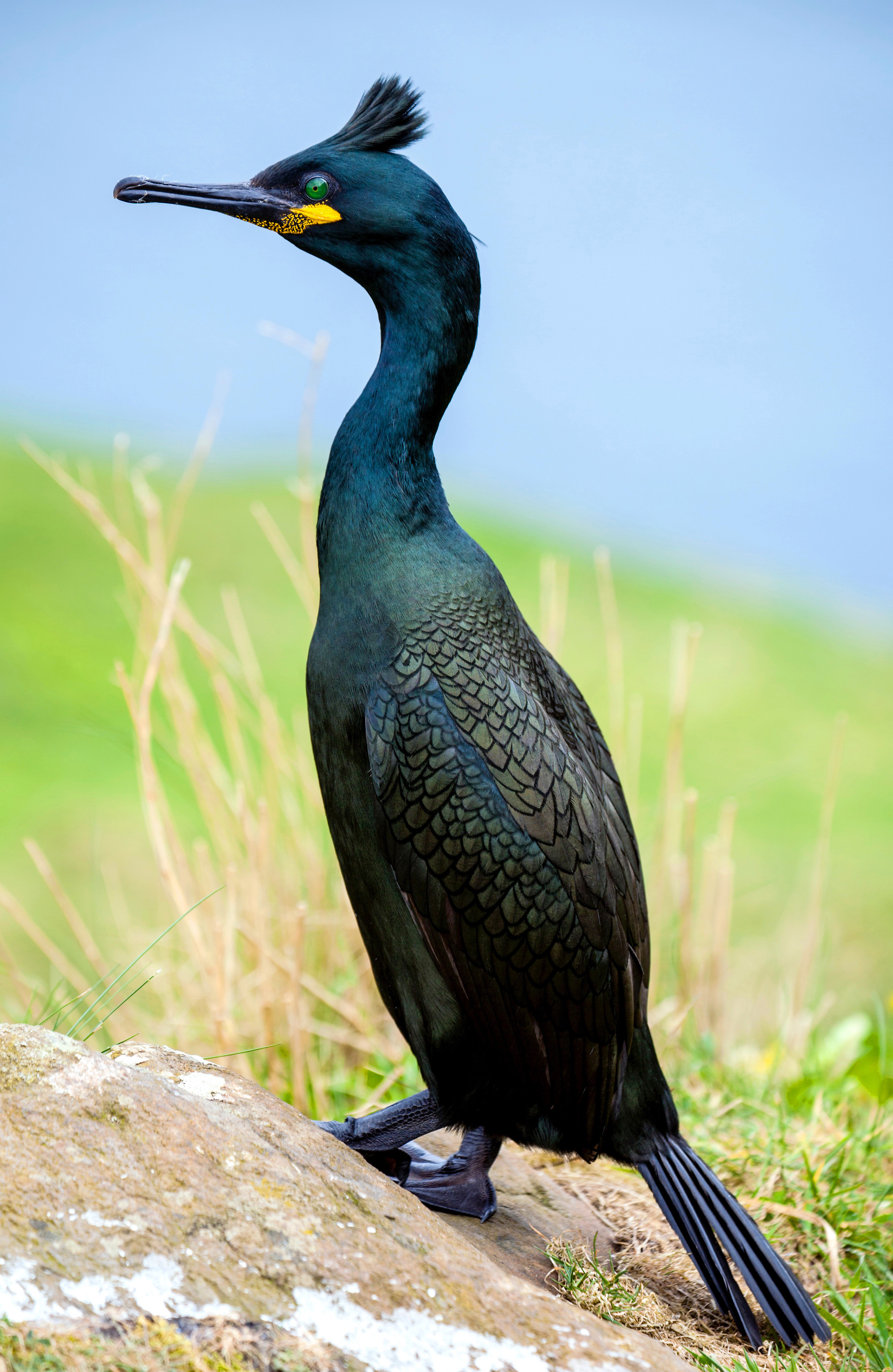 The European shag Phalacrocorax aristotelis looks similar to the Cormorant but is smaller and slimmer with a distinctive steep forehead. In the breeding season, adults develop a dark iridescent green plumage and an obvious crest on the front of their head that curves forward, from which the name shag is derived. Shags often feed in large groups, diving deeply from the surface to feed on crustaceans and molluscs on the seabed. In the UK, they breed on rocky coastal sites, mainly in the north and west.