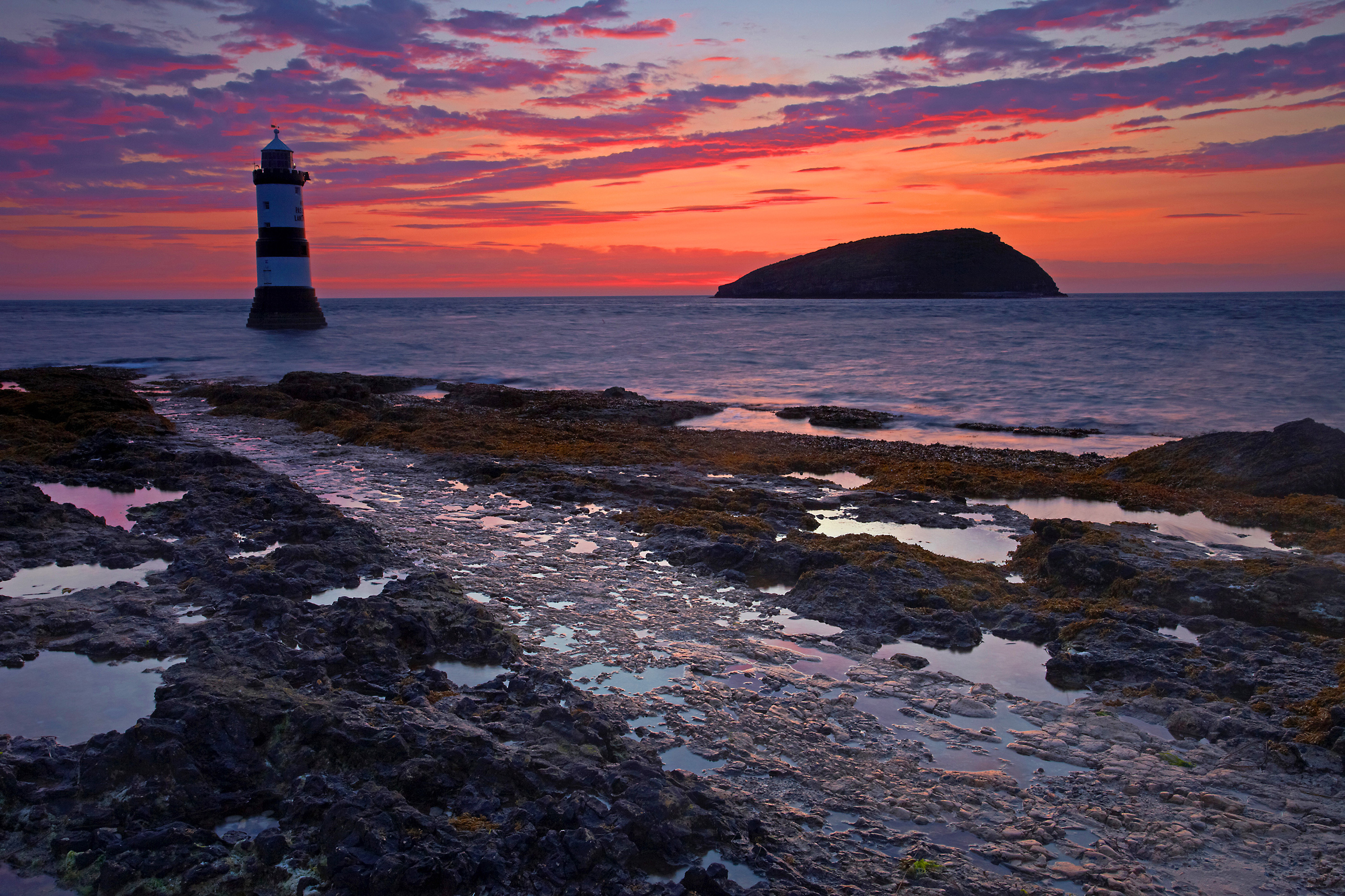 Penmon Point lighthouse guards dangerous rocks protruding into The Sound between Anglesey and Puffin Island 500 metres offshore. Puffin Island is a sanctuary of coastal pelagic life. Its layered limestone cliffs are a haven for razorbills, guillemots and cormorants. Harsh and confusing tidal currents at this entrance to the Menai Straits, deposits nutrients for the diverse inter tidal and deeper sea species that thrive here.