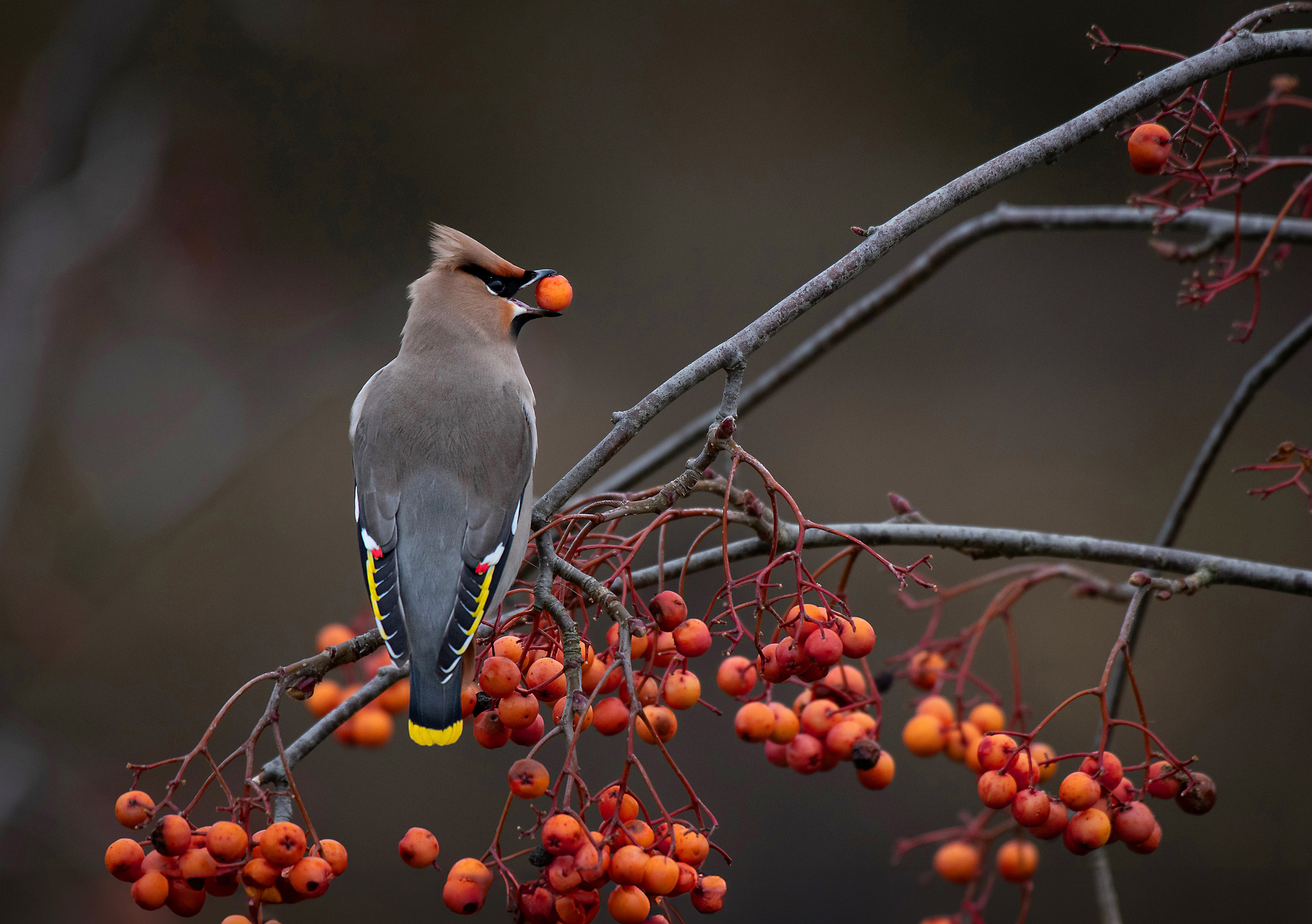 Bohemian Waxwings Bomybilla garrulous only visit the UK in the winter, spending their breeding season in the boreal forest belt that stretches from Scandinavia, and through Russia. The numbers that reach us depend on the availability of berries in Continental Europe. Berries are incredibly important for waxwings in the winter and they typically eat 800-1000 berries a day, roughly twice their body weight. Our native rowan is the favoured plant of waxwings, but they will take other native and non-native Sorbus berries, along with hawthorn, cotoneaster and rosehips.
